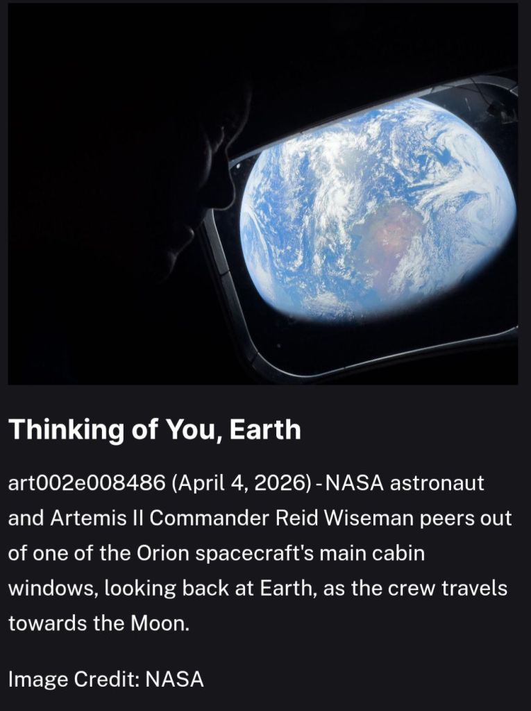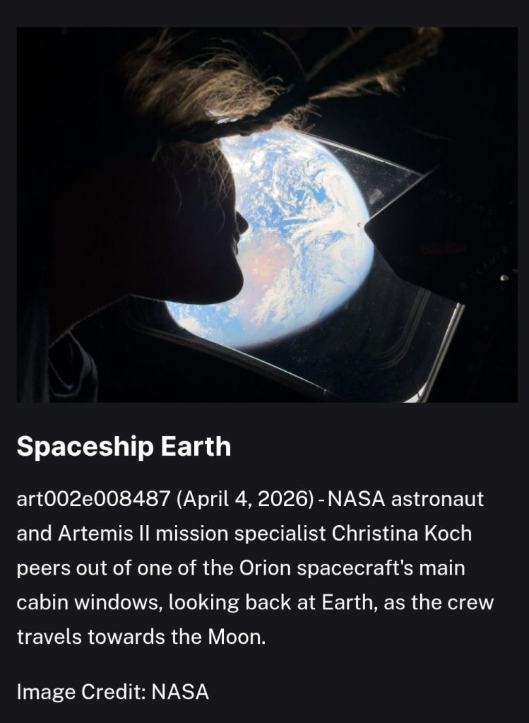 This image, taken by an Artemis II astronaut, shows Earth’s dark side, which means it shouldn’t be visible the way it appears in the photo unless computer-generated technology altered it! As far as I am concerned, it’s CGI!