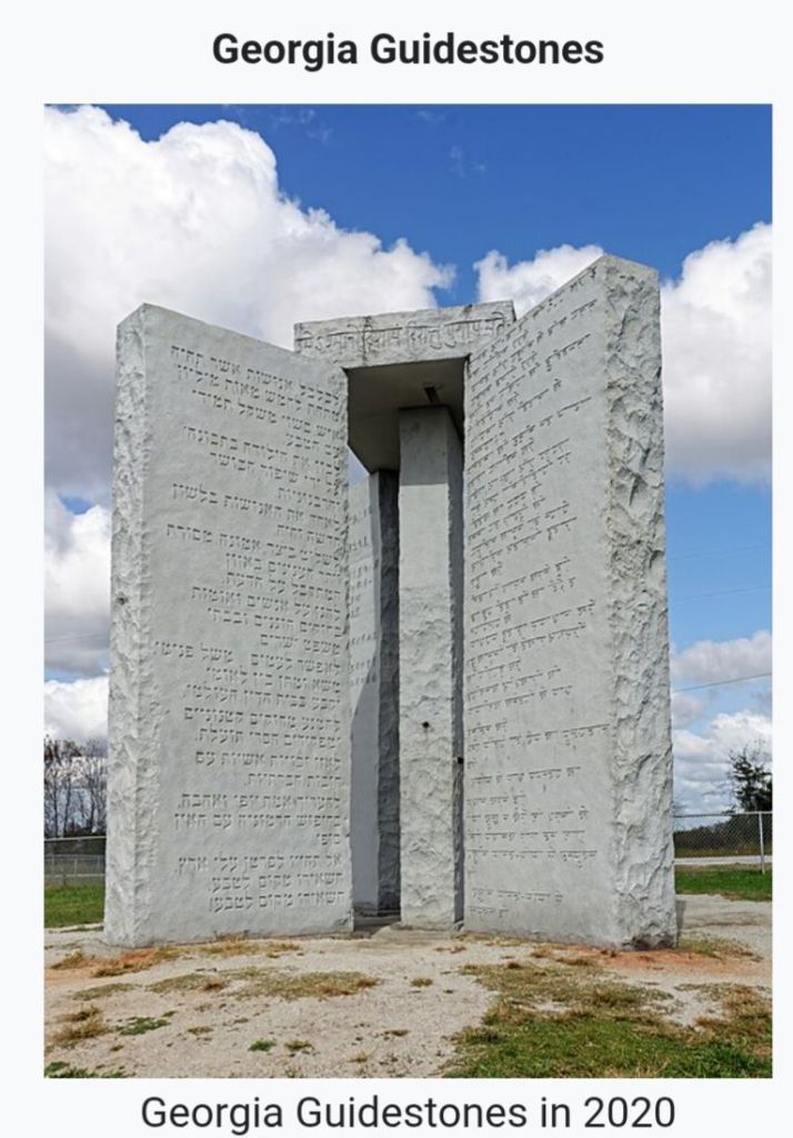 Controversial writings on the monument’s granite walls have been interpreted by many as the wet dream of eugenicists. The writings were in eight languages, calling for the human population to be no more than 500 million.