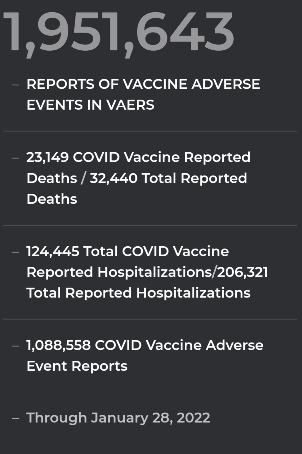 VAERS has a 99% underreporting accuracy rate according to a Harvard University study. Taking the study into consideration, between 2.3 and 3.2 million people have been murdered by the mRNA vaccines to date. I would wager a bet that many more people have bought the farm due to these bioweapons. Many more casualties will follow in the years to come.