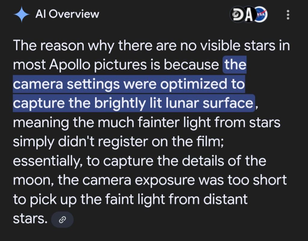 So, this idea that no stars are visible in any of the photos taken on the Moon because camera settings were designed to concentrate on the lunar surface and not on the stars is pure nonsense, in my view. Don’t forget, plenty of other photos were taken in space away from the Moon and there’s no starlight visible there either.