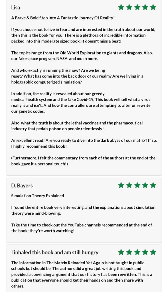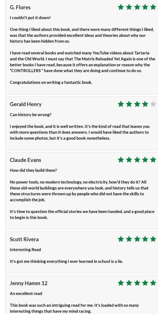 Our book is written for the red pillers — those folks already awake. The Matrix Reloaded Yet Again is an essential starting point for readers who can do more extensive boots-on-the-ground research after reading our work.