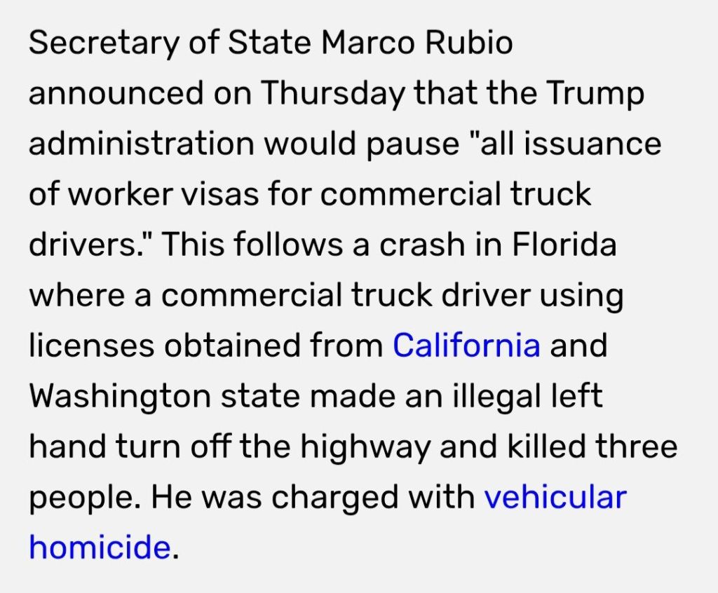 Truck drivers are vitally crucial to the sustainability of any given country. We need competent, safe professionals in America driving these rigs. If you’re here legally, you can read the nation’s road signs and can obey the traffic laws, regardless of what country you’re from, including America, I don’t have a problem with you.