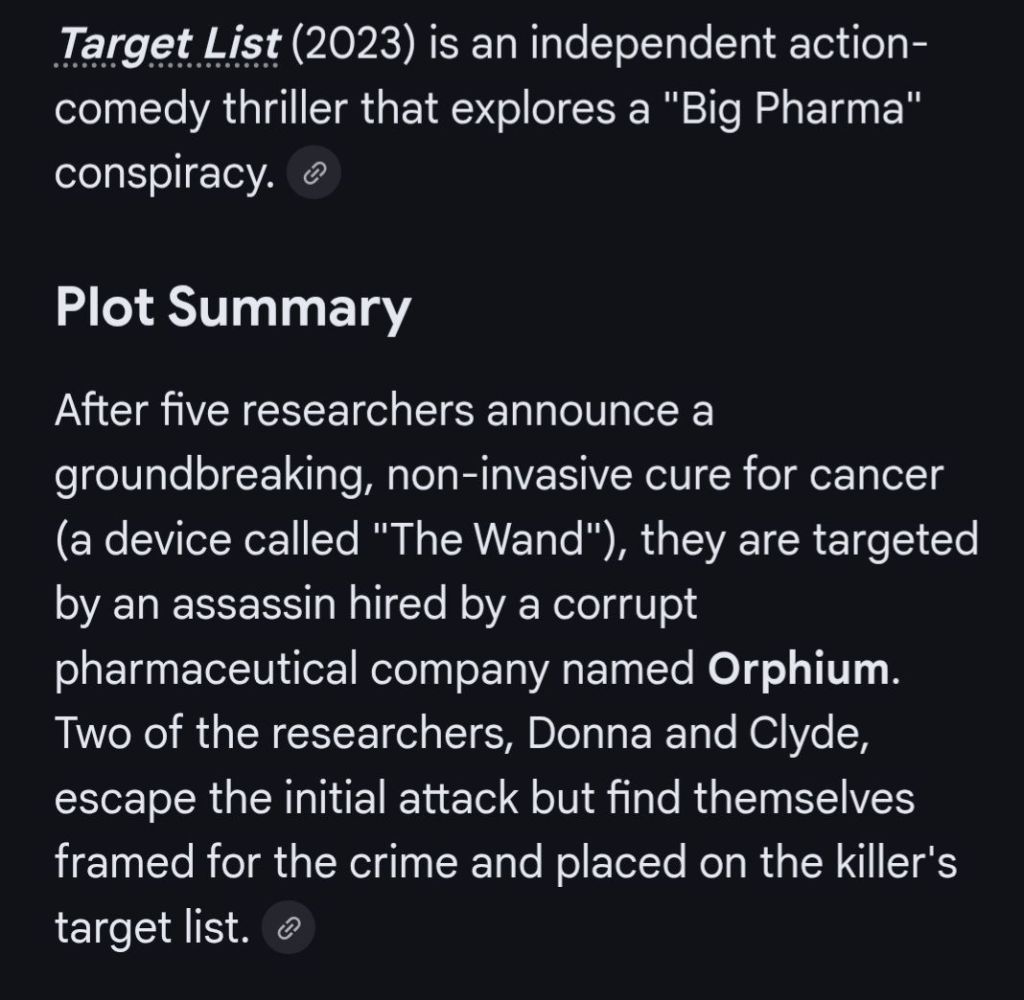 The answer is very simple to understand. Target List’s underlying message is that Big Pharma is trying to suppress attempts to eradicate cancer. That’s the fictional film’s message, and the controlling powers don’t want the public ever thinking about the pharmaceutical industry this way.