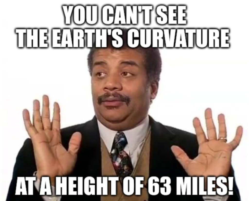 People can see a ship gradually disappear below the ocean horizon, supposedly because of the Earth’s curvature. That distance is approximately three or four miles. According to NASA and the genius pictured above, the curvature of the Earth can’t be observed at a height of 63 miles. I smell bullshit!