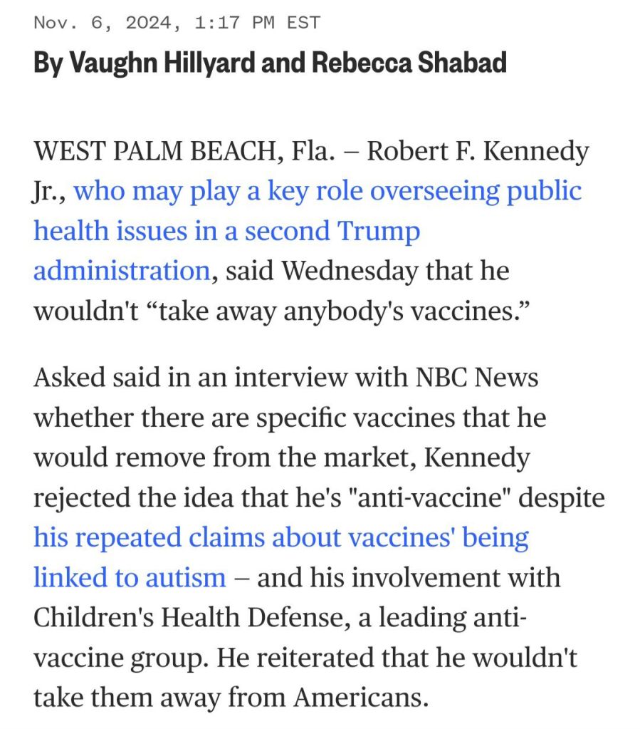 During his victory speech in the early hours of November 6th, Trump instructed RFK, Jr. to have fun with healthcare but to leave Big Oil /Big Pharma alone. The next day, Kennedy pledged allegiance to his masters on NBC News by stating he wasn’t an anti-vaxxer and wouldn’t be taking away anyone’s highly coveted vaccines.