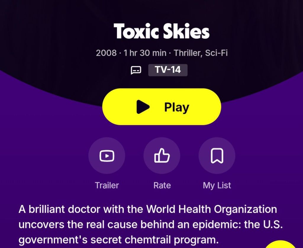 Watch this 2008 movie on Tubi about Chemtrails. It’s hard to believe they made the production and got it on this or any platform. Of course, they glamorize a vaccine at the end of the film, but if you can ignore the arse kissing of big pharma, it’s worth the watch.
