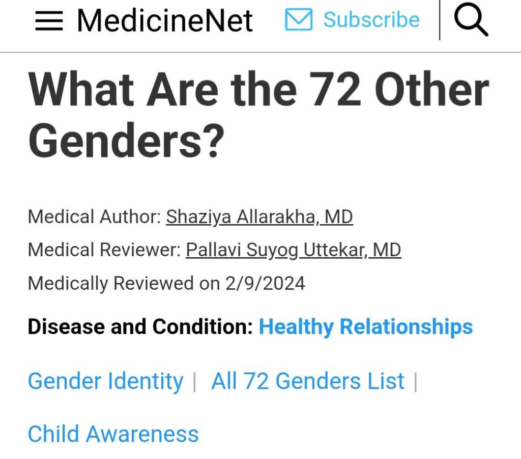 The above-referenced article is published in a medical magazine. The piece was authored by two medical doctors and researchers (scientists). These highly educated (indoctrinated) individuals want laypeople to believe that there are 72 different genders in biological existence.