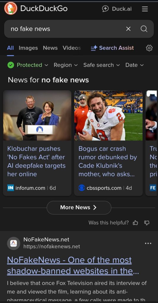 Next, I entered the exact search inquiry for no fake news on the following sites: Bing.com, Yahoo.com, Duckduckgo.com, and Microsoft.com. These sites returned pertinent search results about my website at the top of their pages.
