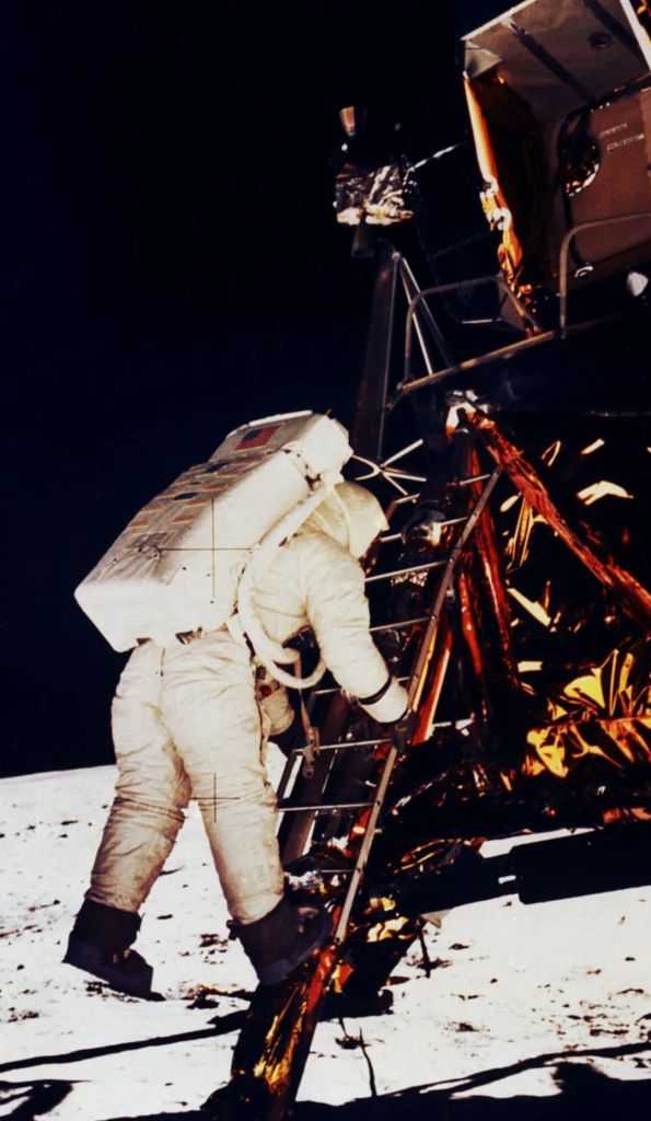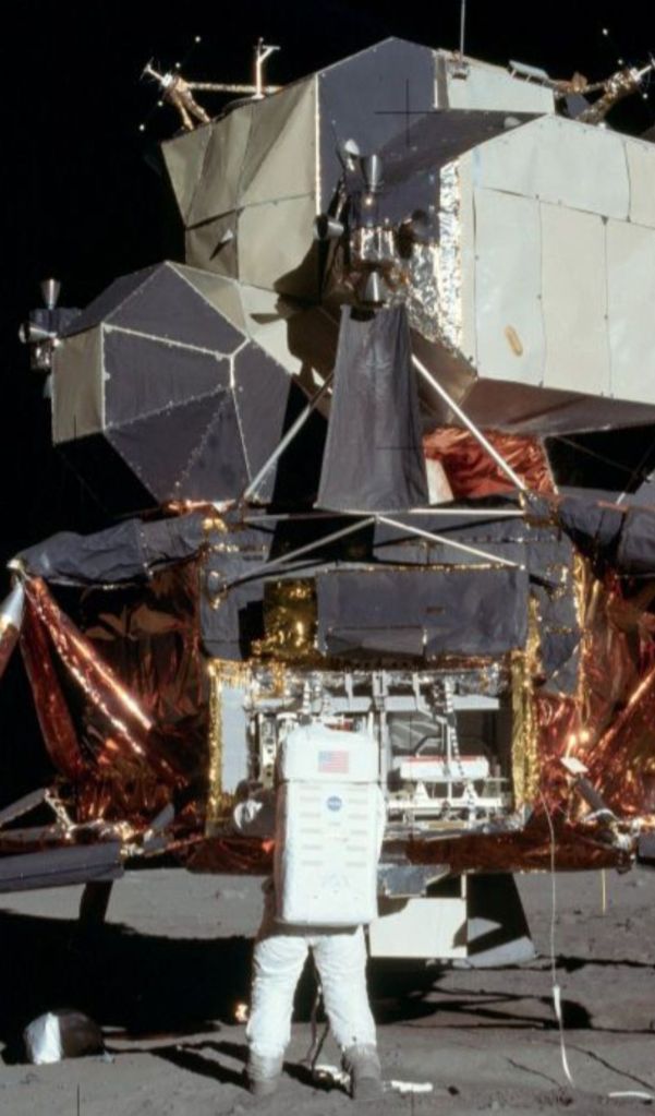 In this second image, taken by one of the astronauts on the Moon, the astronaut is standing up against the lunar lander, with both feet on the lunar surface, and the top of his space pack appears to reach about half the height of the foil wrapping.