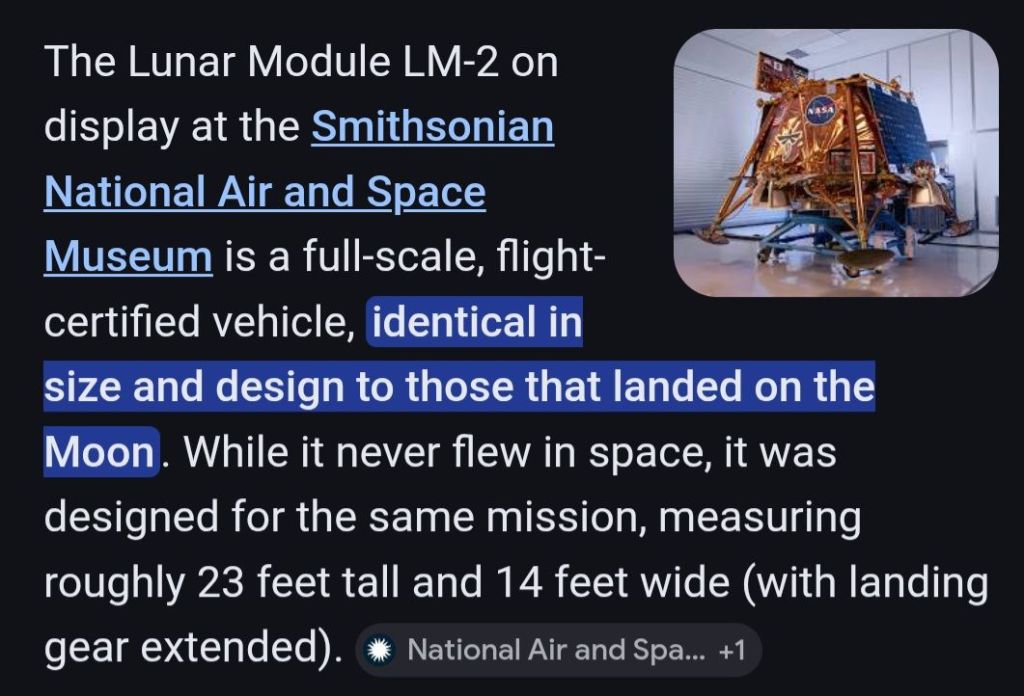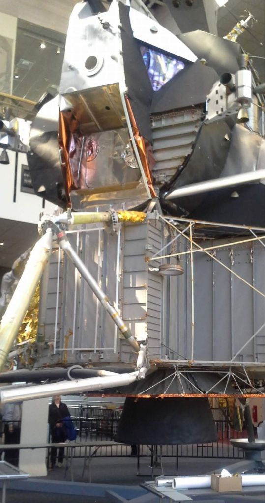 In the photo below, taken by yours truly at the Smithsonian Air and Space Museum in Washington, DC, in 2016, I was on the ground. You can clearly see a woman on the other side of the lunar lander standing on the ground. We are both looking up, and our heads are barely above the ship’s engine exhaust vent.