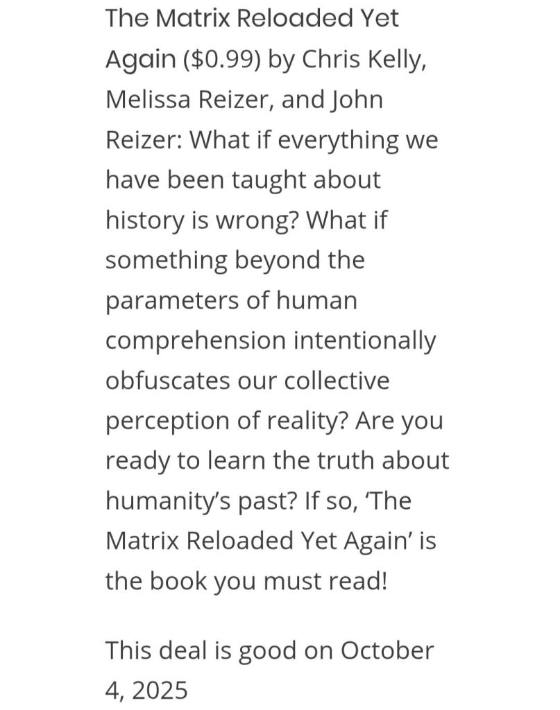 “The Matrix Reloaded Yet Again” is a book by Chris Kelly, Melissa Reizer, and John Reizer that explores the idea that our understanding of history and reality has been manipulated. The book delves into concepts like alternative timelines, simulated reality, and the existence of advanced ancient civilizations, encouraging readers to question the accepted narrative of history.
