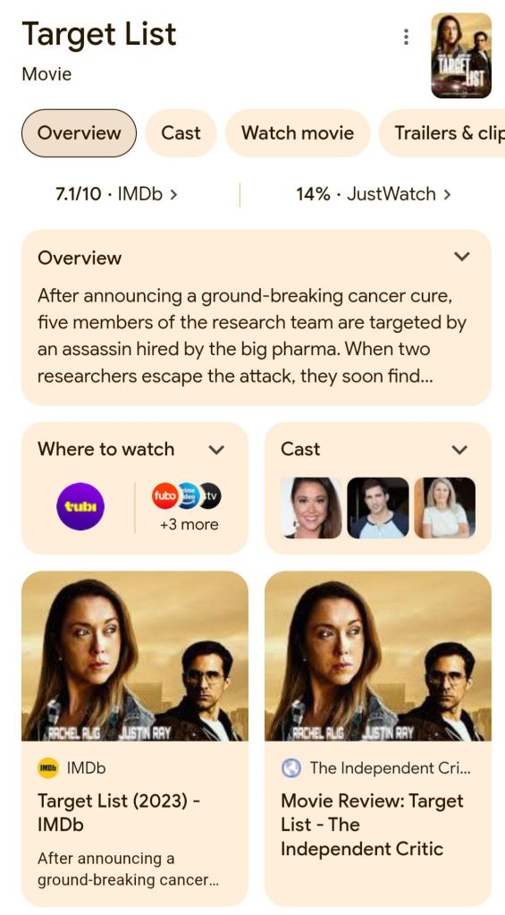 Since its release in 2023, Target List has received nine thumbs-up ratings, with no accompanying review comments on that platform. Our score on JustWatch was very respectable until recently, and appeared alongside our impressive IMDb rating on search engines.